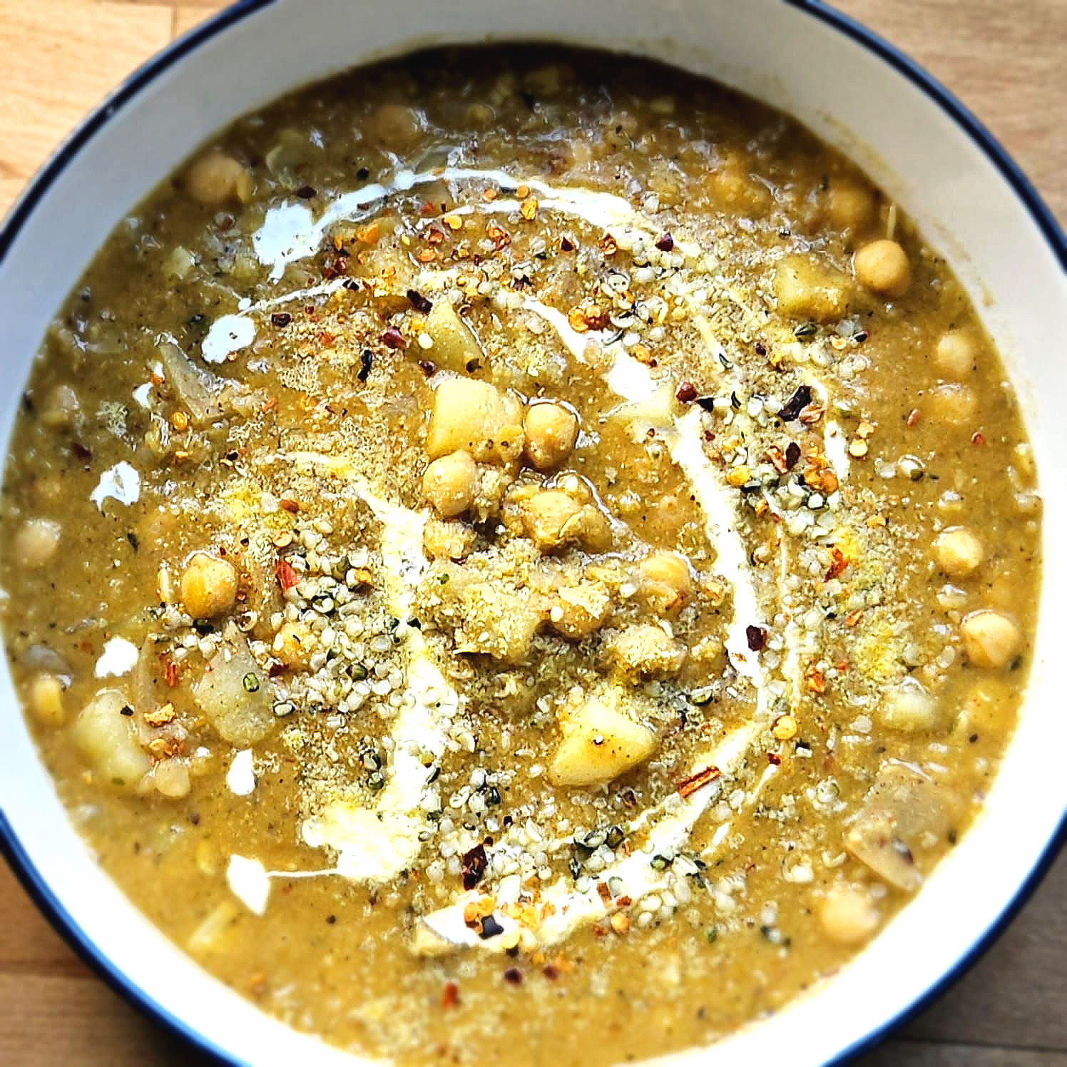 - Add chickpeas, potatoes, herbs, onion, garlic, and veg stock to a big pot and bring to a boil, turn down to a gentle simmer and bubble away stirring frequently until the potatoes are softened, around 15- 20 minutes depending on size of potato, (add more water if the soup is looking a bit dry or sticking to the bottom of the pan).