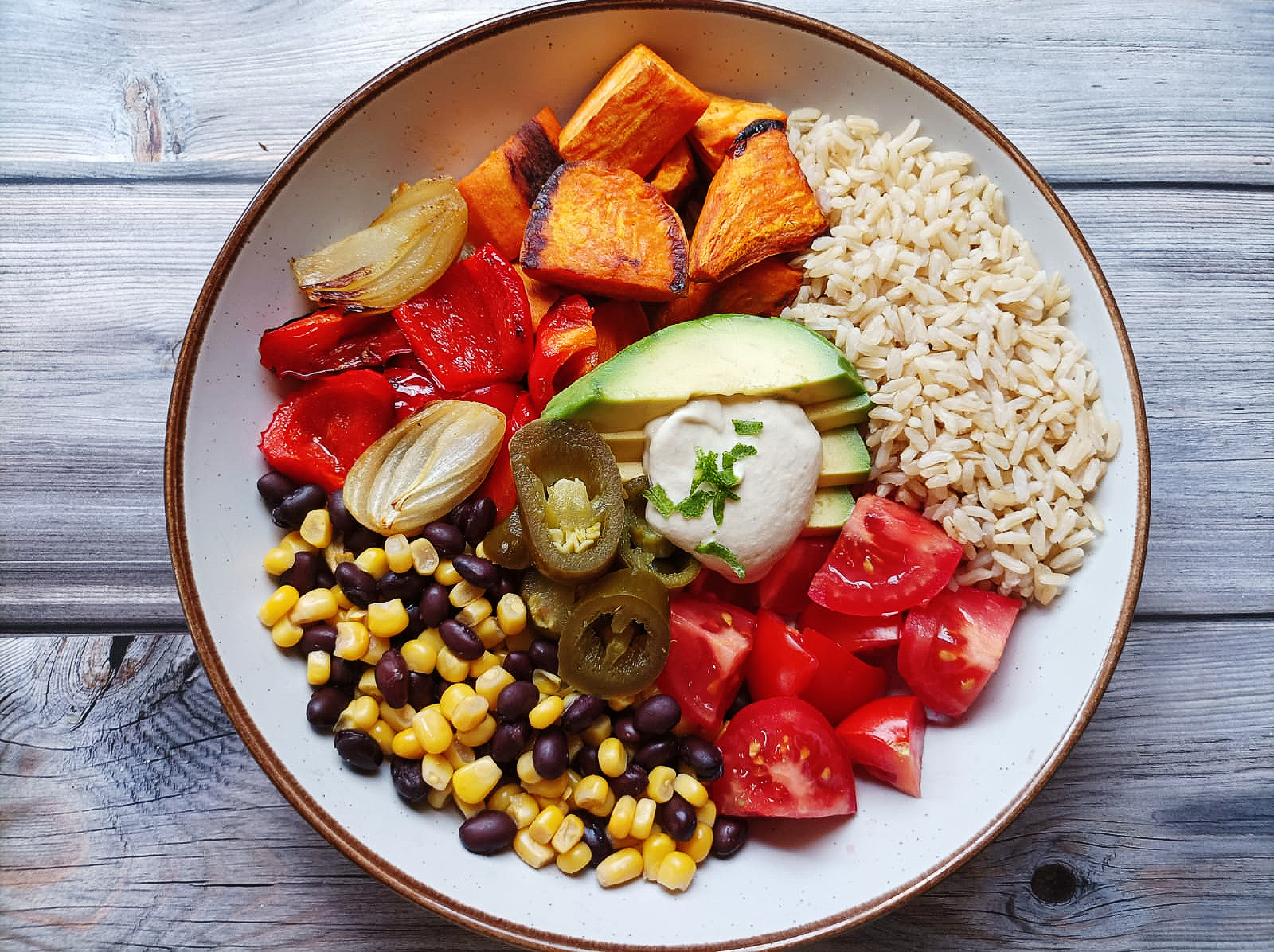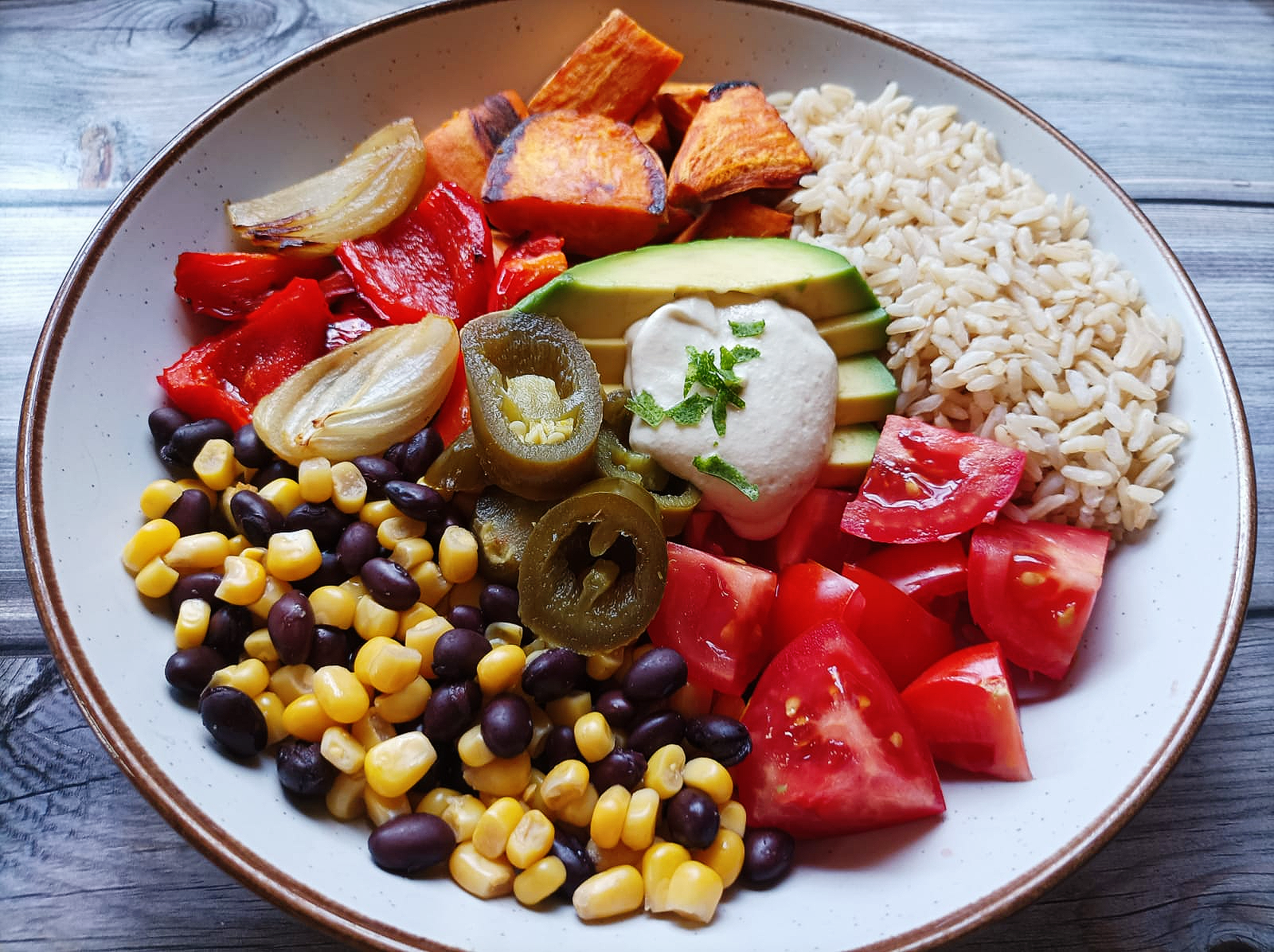 - Now it's time to make up your bowls, spilt the brown rice into 4 containers or bowls, then add equal portions of black beans and corn, tomatoes, roasted veggies. Then top with avocado, cashew cream, and jalapenos.