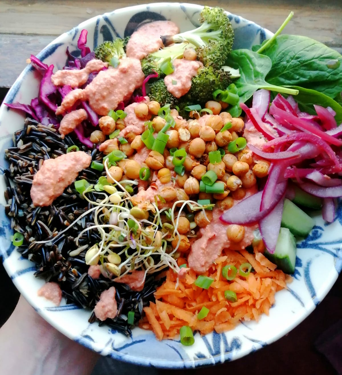 - Top with your dressing and sprouts/ spring onion if using